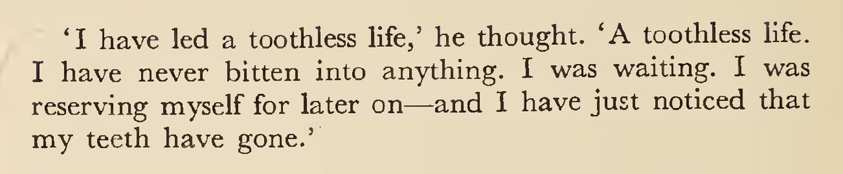 “لقد عشت حياةً بلا أسنان”، هكذا حدّث نفسه. “حياة بلا أسنان، لم أعض بنواجذي على أي شيء. كنت أنتظر! كنت أحتفظ بنفسي لوقت لاحق، للمرحلة المناسبة، للتو لاحظت أن أسناني تلاشت..”.