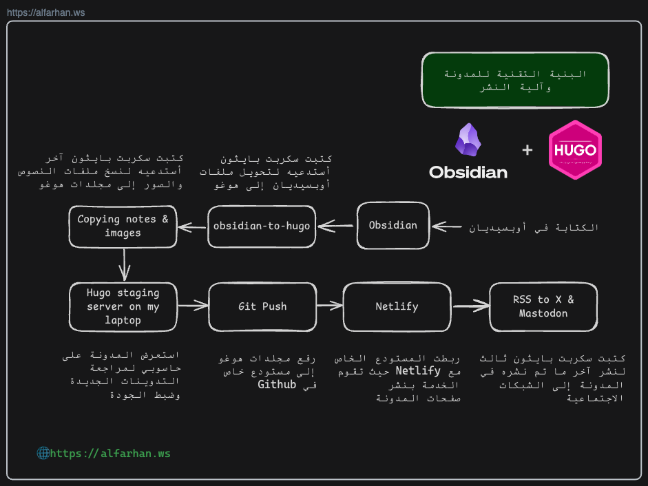 حياتي أصبحت تتمحور حول تطبيق Obsidian للكتابة. وأحببت أن يتم النشر مباشرة من أوبسيديان بدون منصة مستقلة، فاخترت نظام Hugo لخدمة الملفات الثابتة.